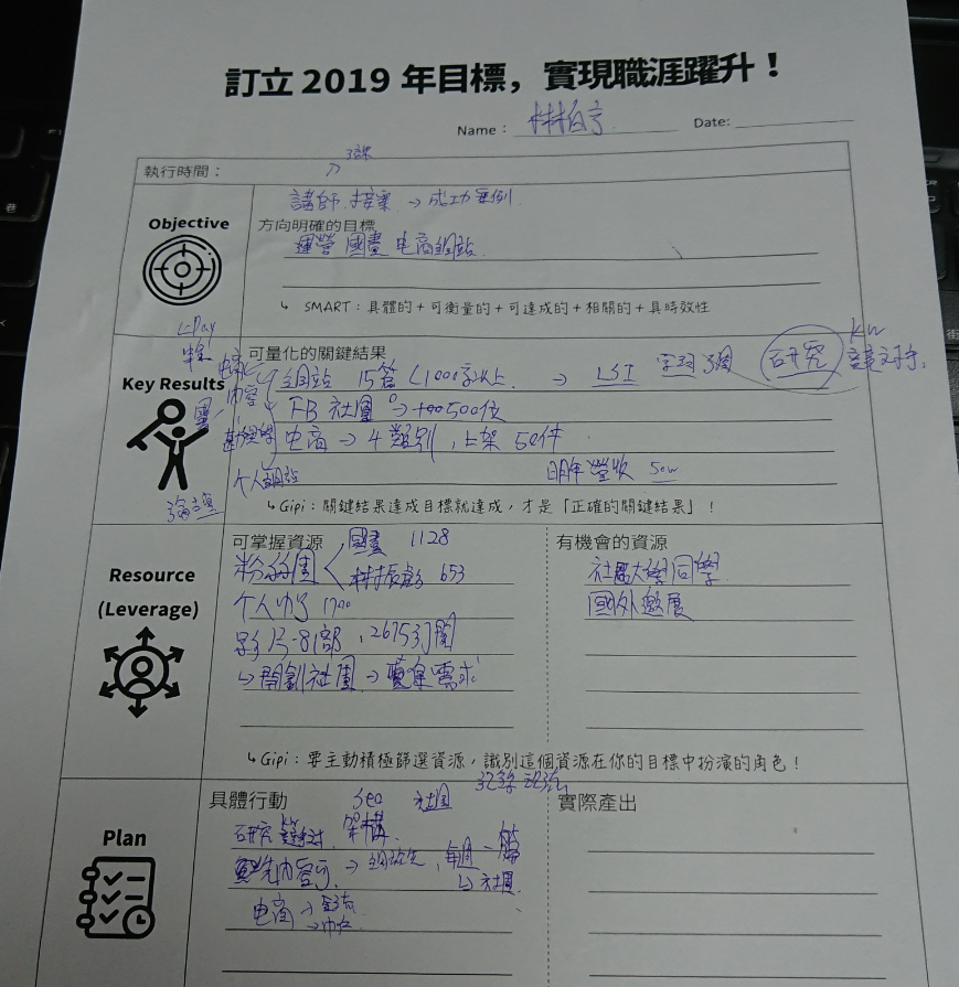 自己今年於年初三月,參加Gipi職涯躍升的關鍵24堂課,當時的策略地圖訂今年目標五場,到目前為止實質上2場(不同開課單位),但是目前才26歲的自己,有機會能去講小人提的場次,覺得小人提一場可以抵兩場XD”。