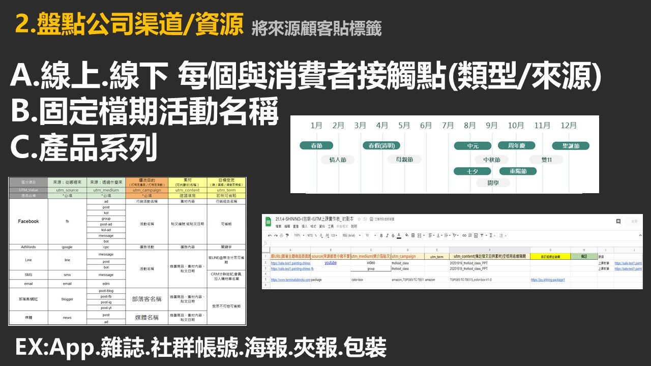 GA基礎觀念、各報表(目標對象、行為、客戶開發、目標轉換)、區隔、自訂報表、區隔、UTM。