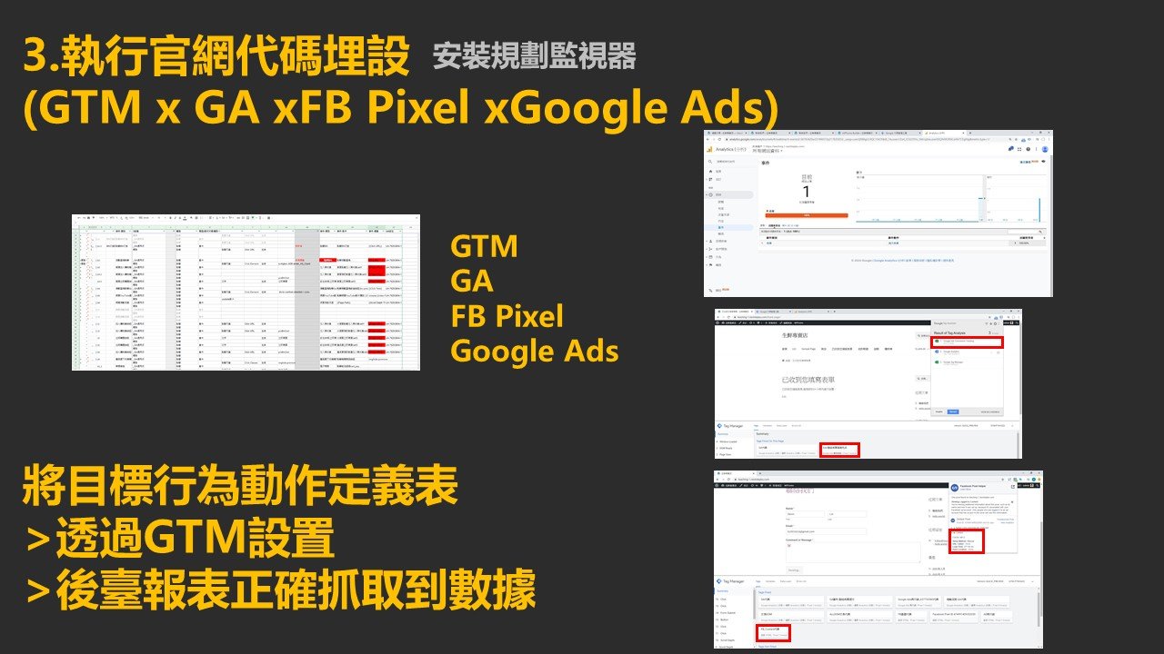 GA基礎觀念、各報表(目標對象、行為、客戶開發、目標轉換)、區隔、自訂報表、區隔、UTM、搭配WordPress實作GTM串GA。